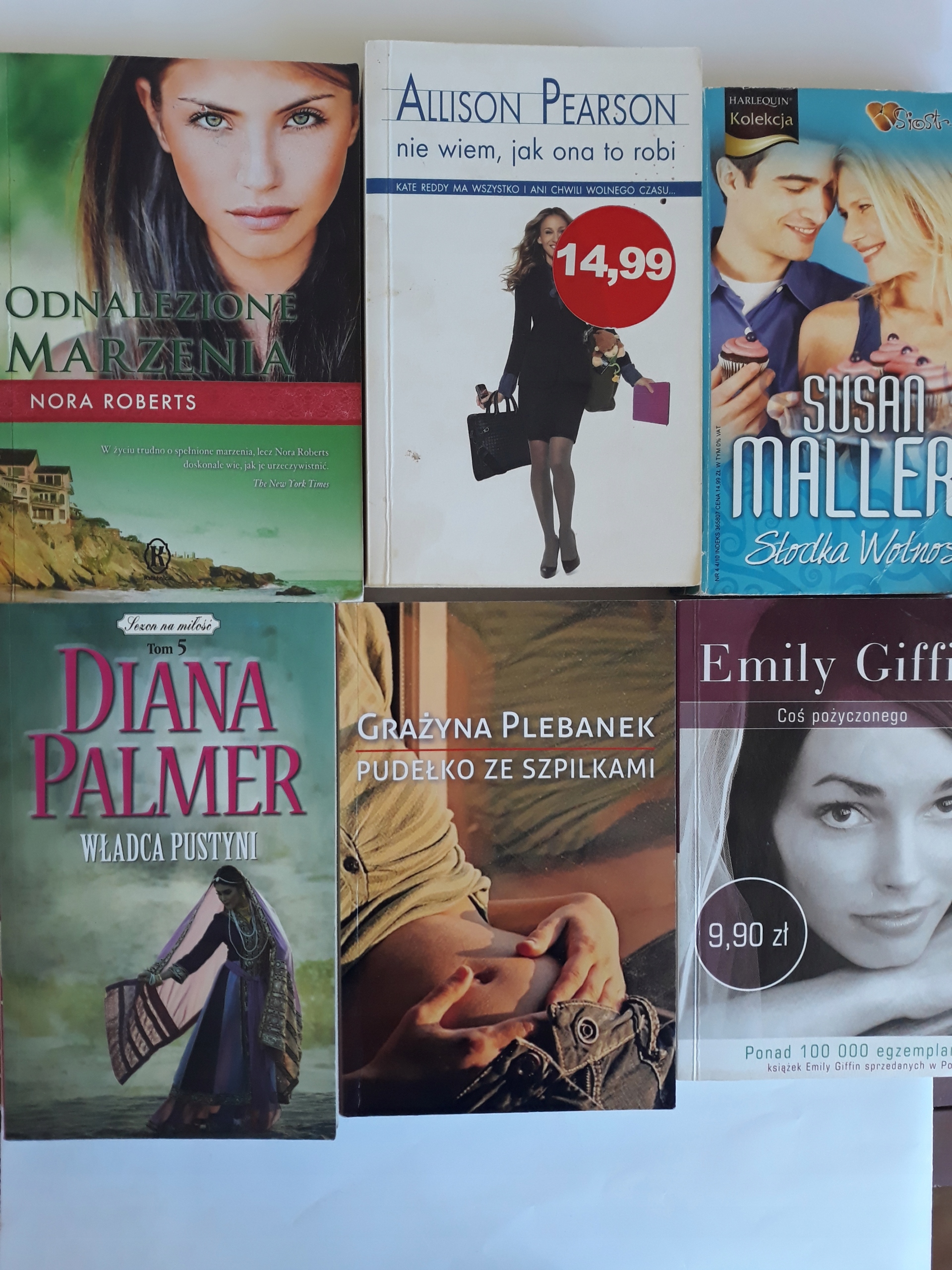 Tanie książki w zestawie. To książki obyczajowe, które z pewnością zadowolą miłośniczki literatury obyczajowej. Cena dotyczy całości zestawu - 6 sztuk. W skłąd zestawu wchodzą: Coś pożyczonego - Emily Giffin, Pudełko ze szpilkami - Grażyna Plebanek, Władca pustyni - Diana Palmer, Słodka wolność - Susan Mallery, Nie wiem jak ona to robi - Allison Pearson, Odnalezione marzenia - Nora Roberts