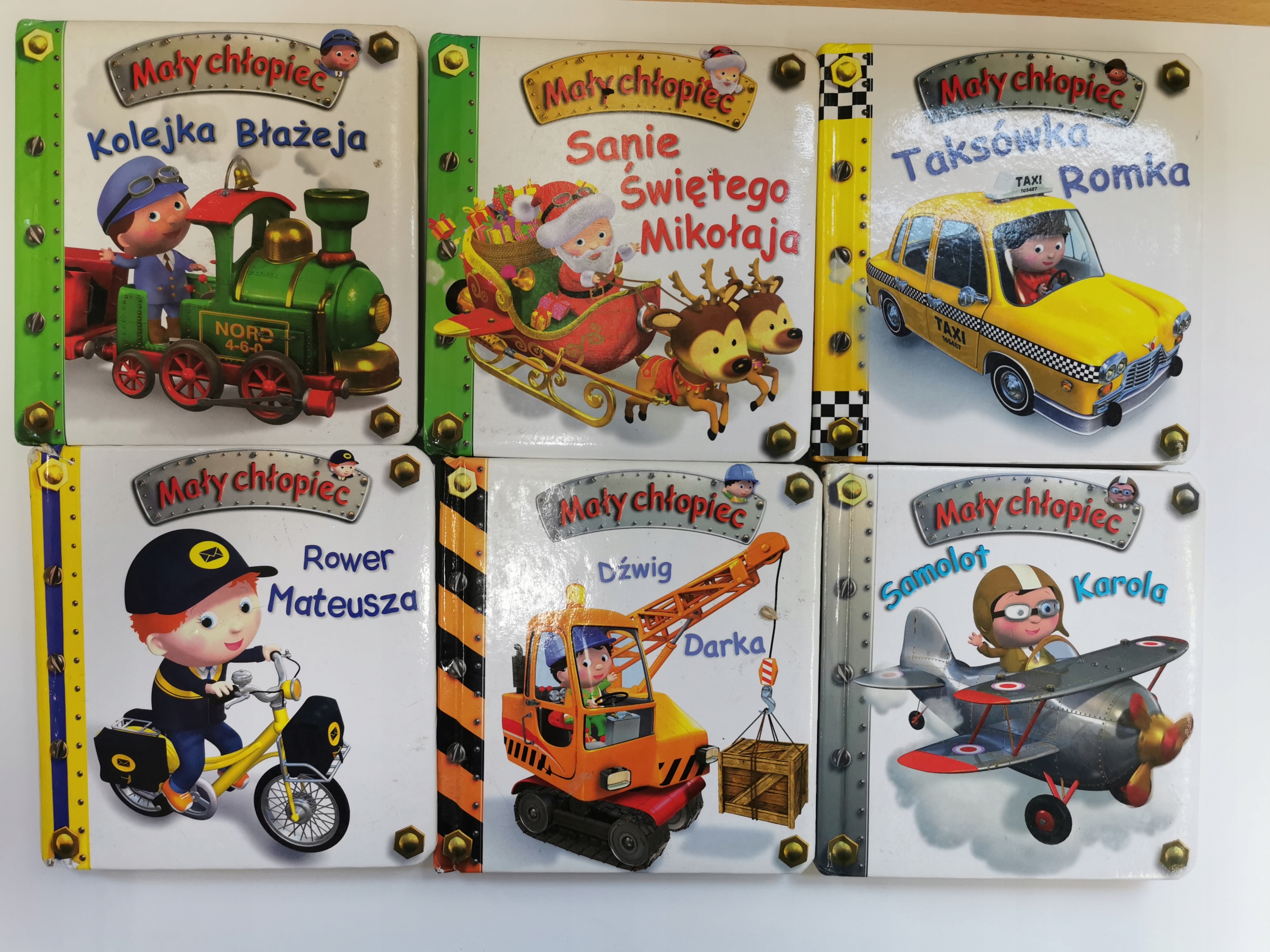 Tania książka - W skład zestawu wchodzą: Sanie Świętego Mikołaja, Kolejka Błażeja, Taksówka Romka, Dźwig Darka, Rower Mateusza, Samolot Karola